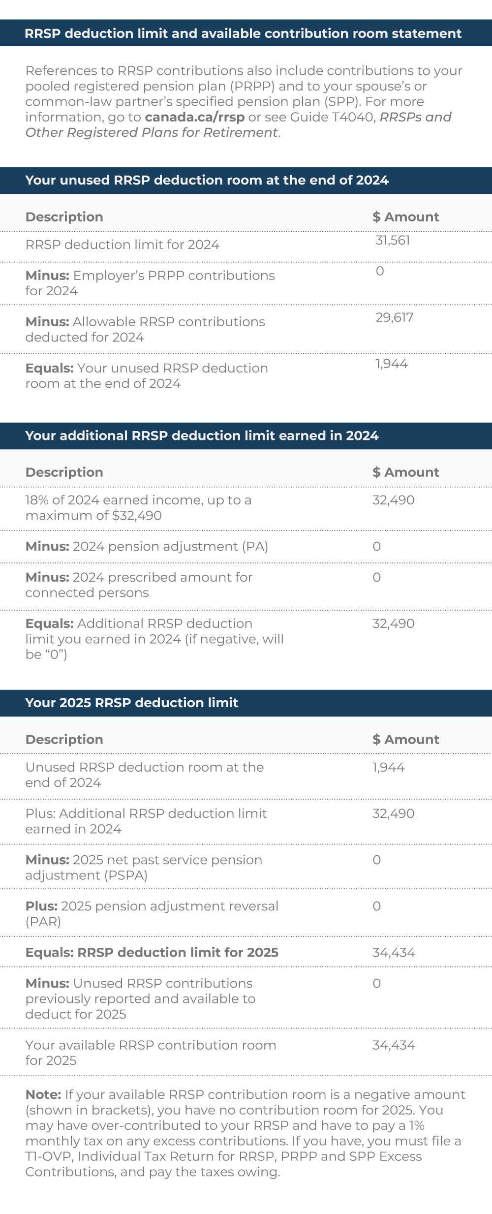 The first section, “Your unused RRSP deduction room at the end of 2024”, outlines Julie’s 2024 RRSP deduction limit of $31,561 less her 2024 RRSP contributions deducted of $29,617. Accordingly, Julie has unused RRSP deduction room of $1,944 from 2024.